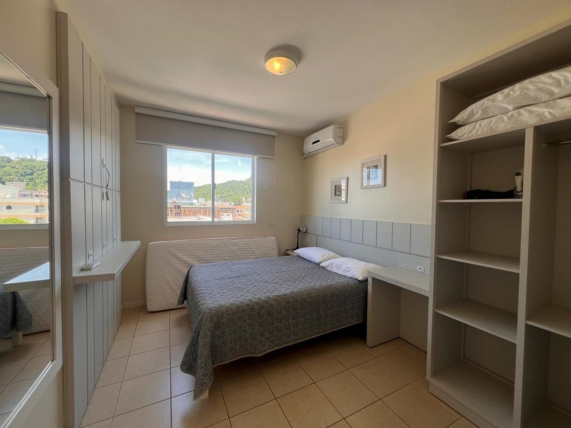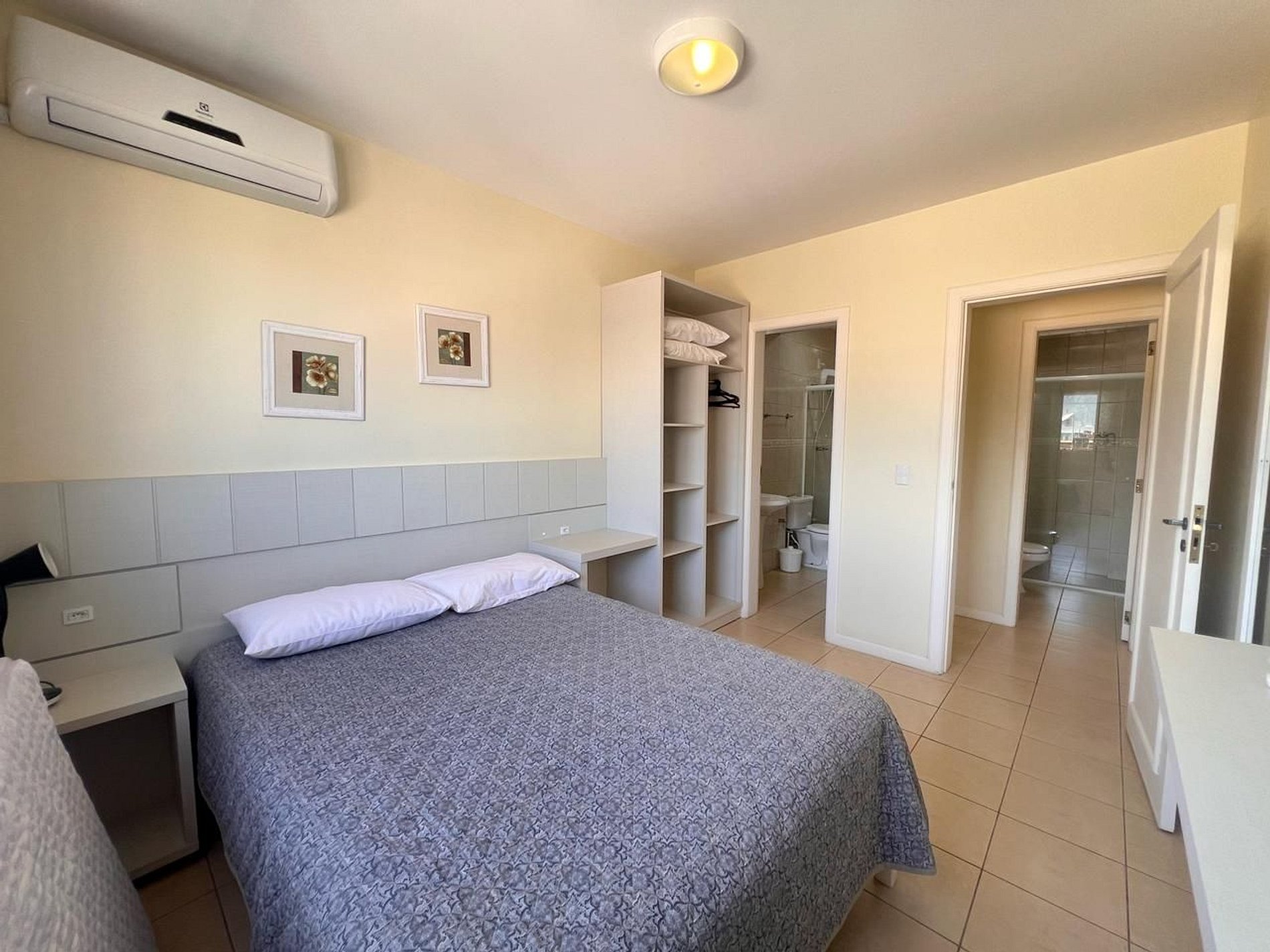 Suíte com 1 cama box de casal, ar-condicionado, roupeiro, cabides, travesseiros.