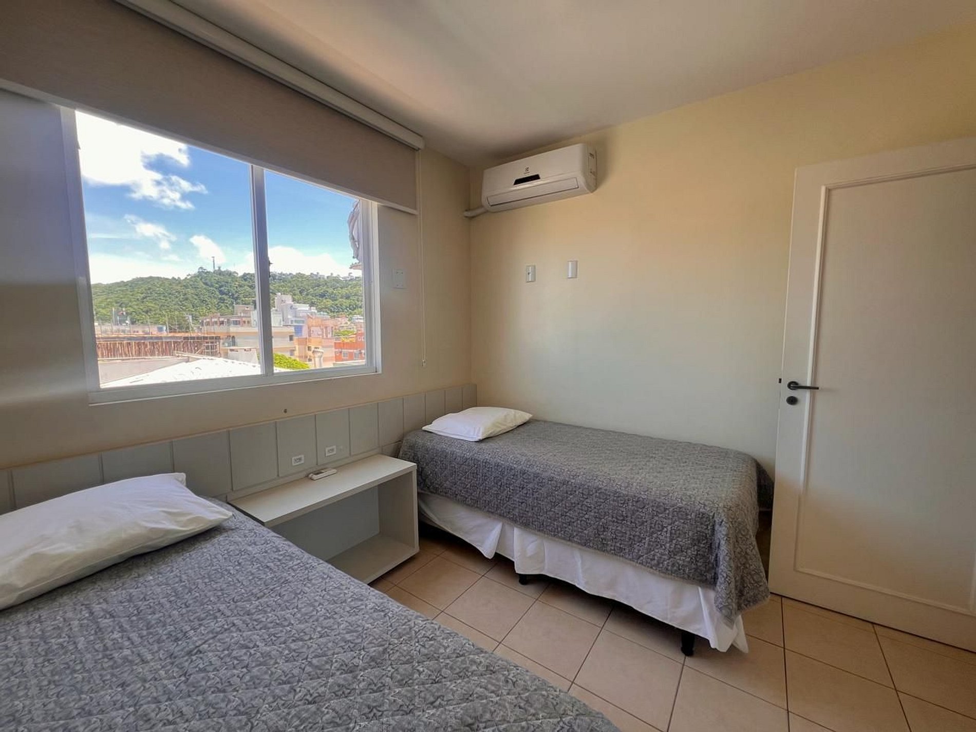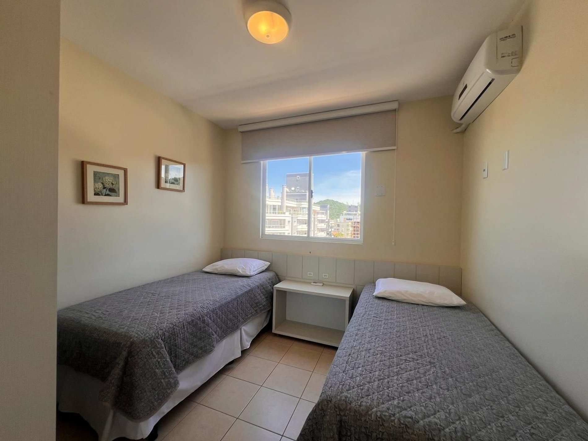 Dormitório com 2 camas de solteiro, ar-condicionado, roupeiro, cabides, travesseiros.