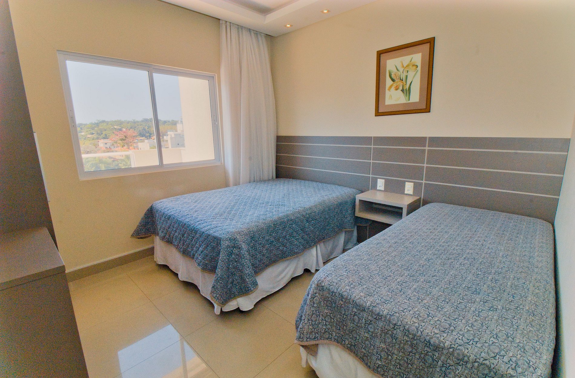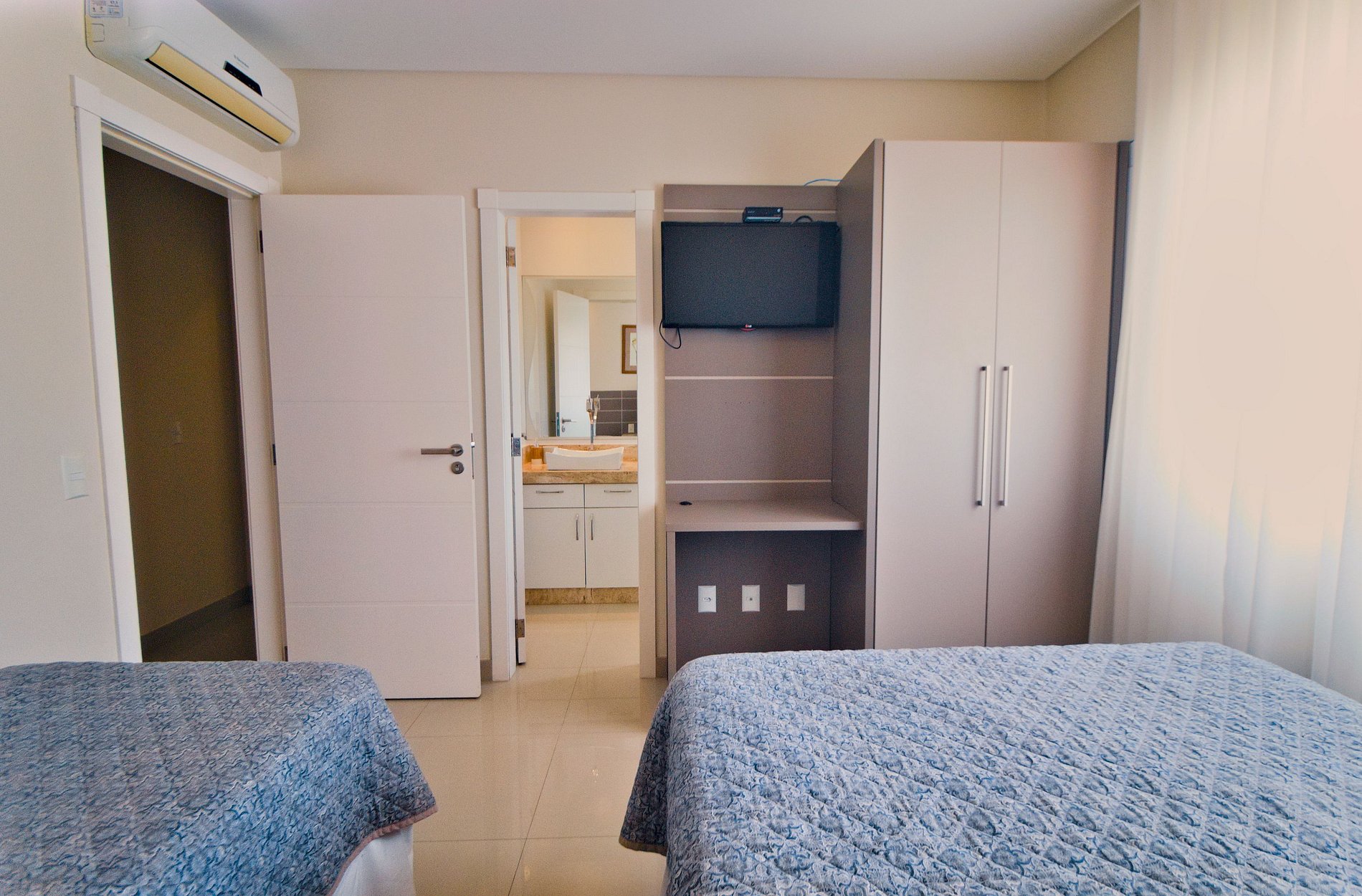 Outra suíte com 1 cama de casal queen, 1 cama de solteiro, ar-condicionado, TV, roupeiro, cabides, travesseiros.