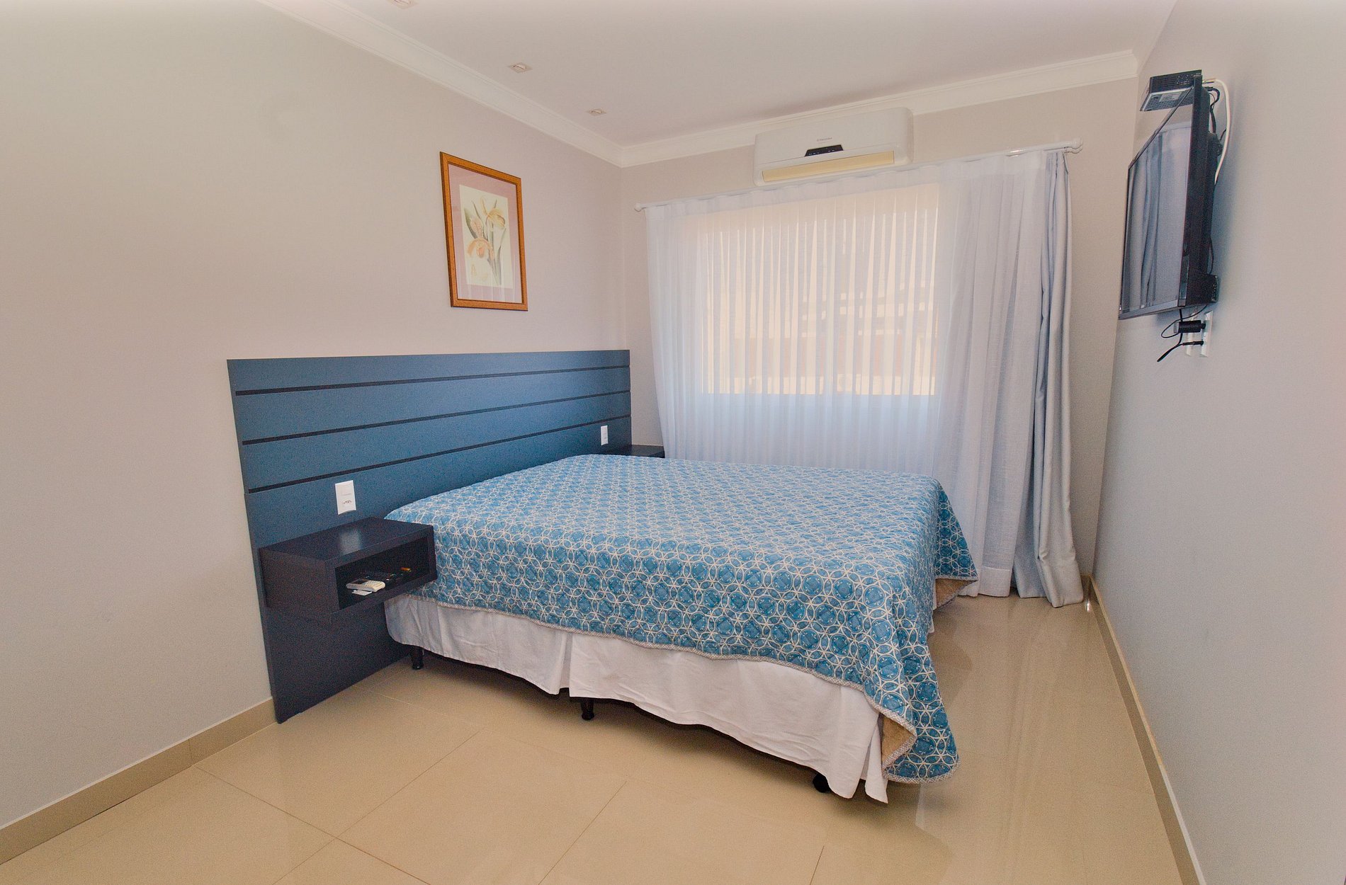 Suíte com 1 cama de casal queen, ar-condicionado, TV, roupeiro, cabides, travesseiros.