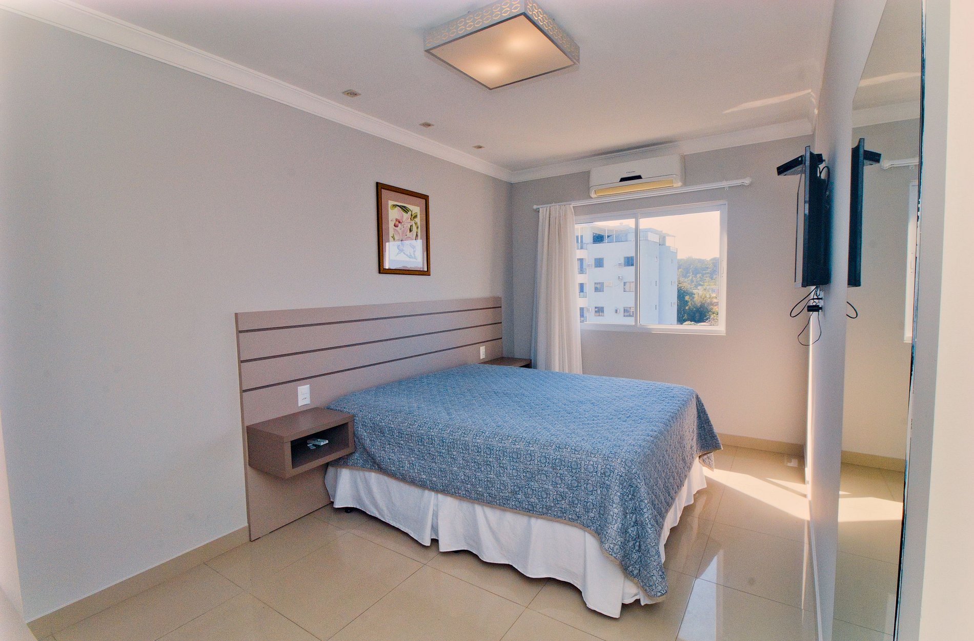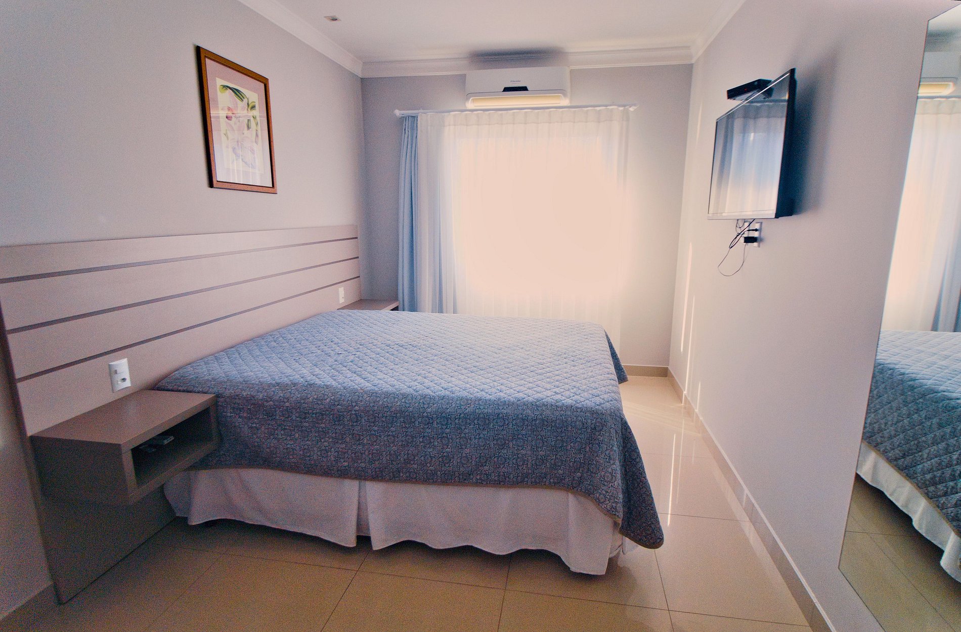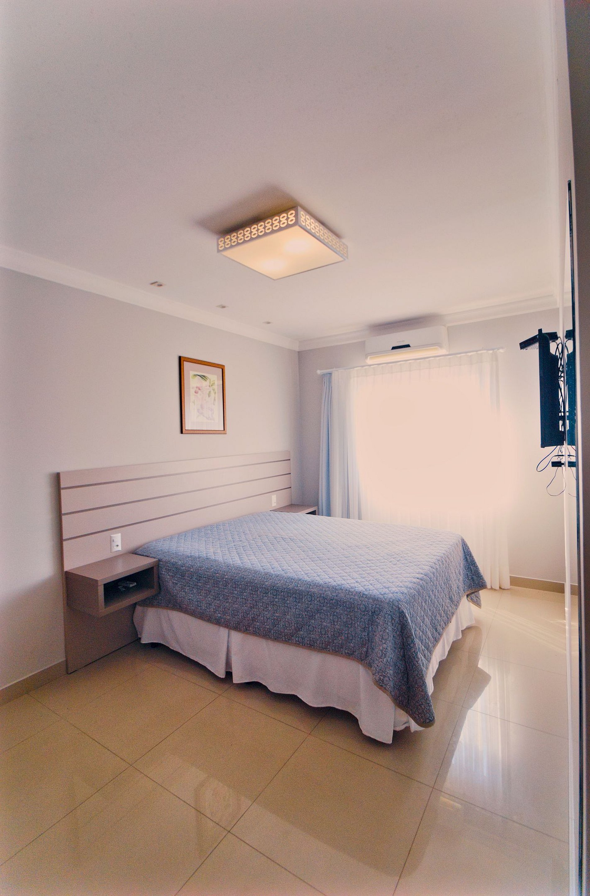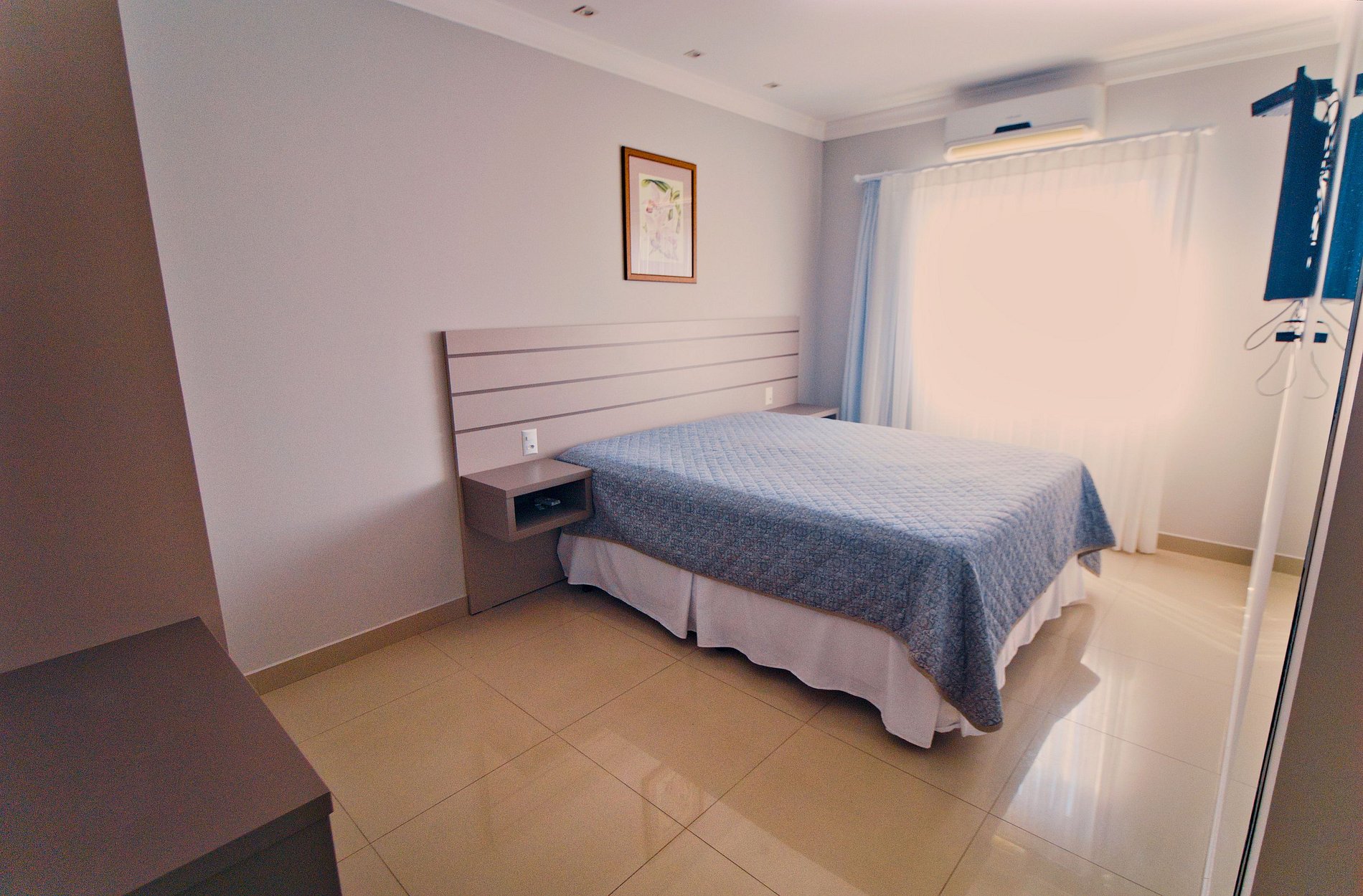 Suíte com 1 cama de casal queen, ar-condicionado, TV, roupeiro, cabides, travesseiros.