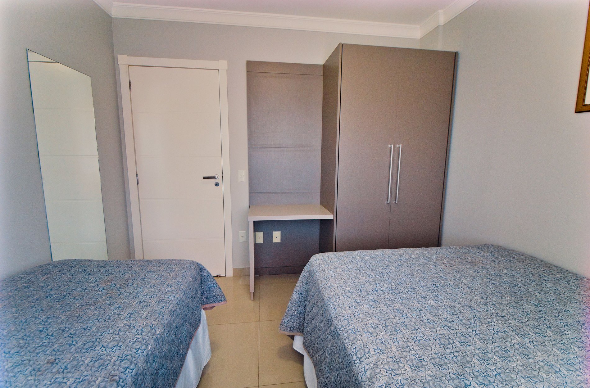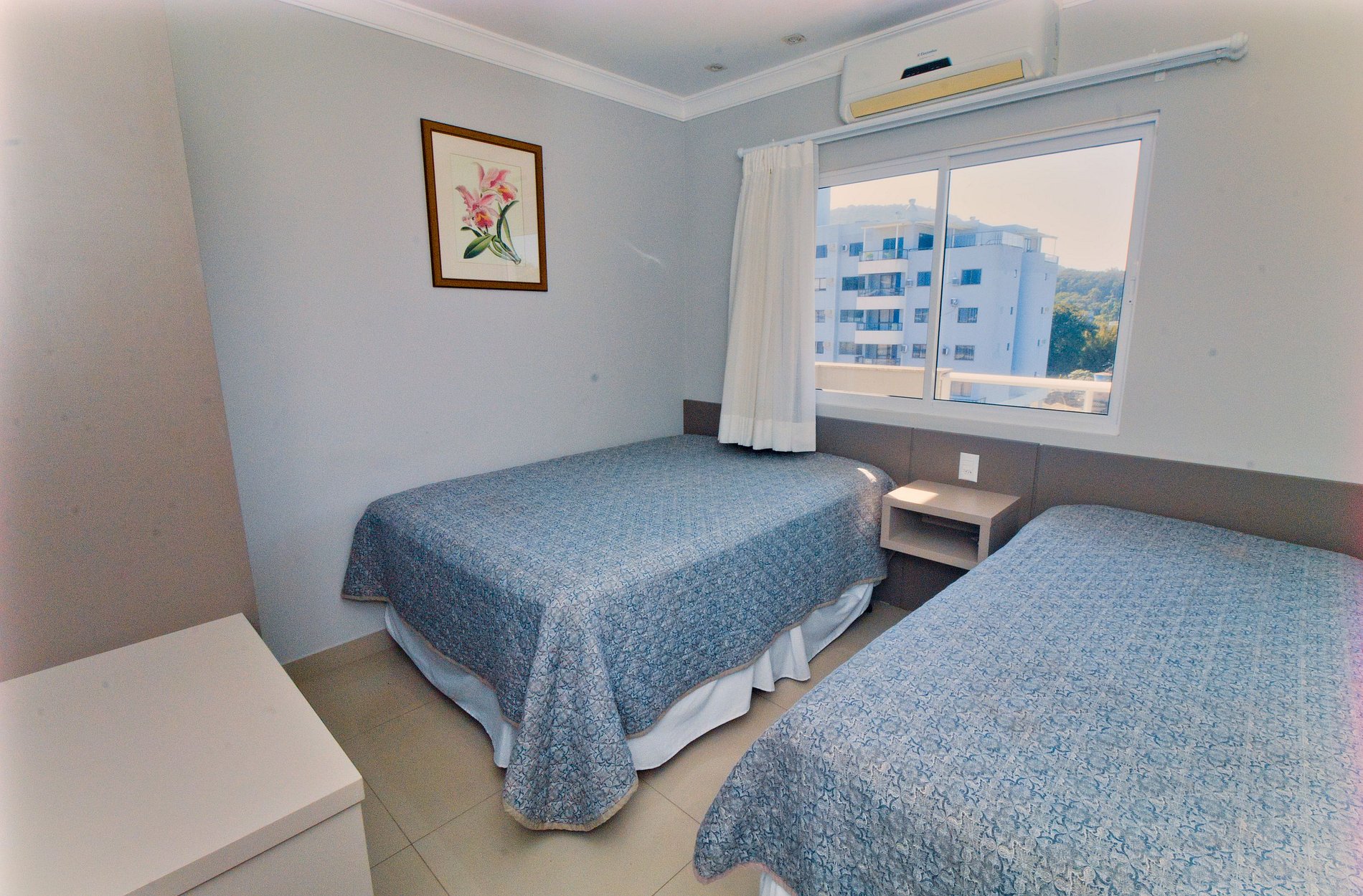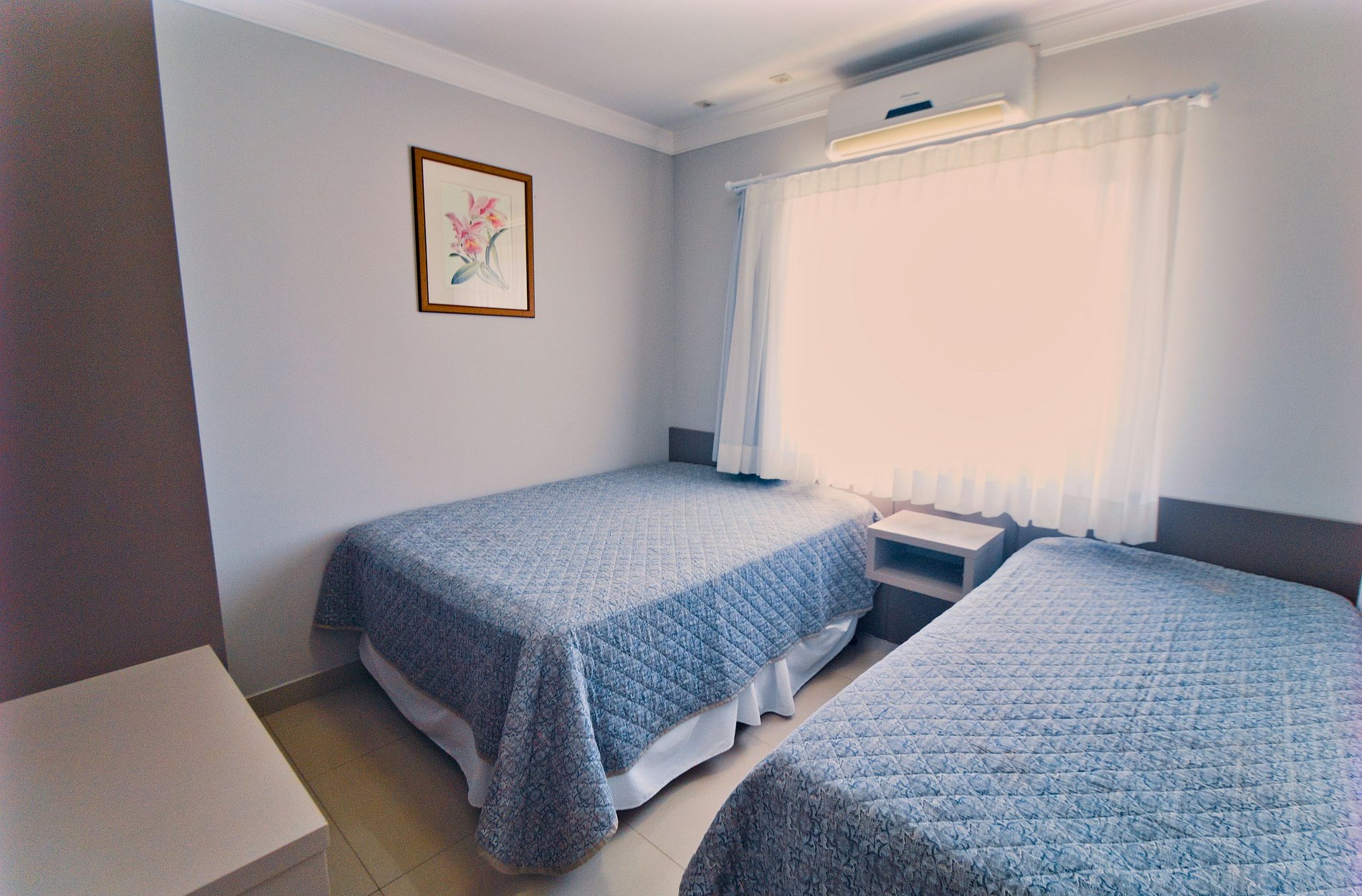 Dormitório com 1 cama box casal e 1 cama box de solteiro, ar-condicionado, roupeiro, cabides, travesseiros.