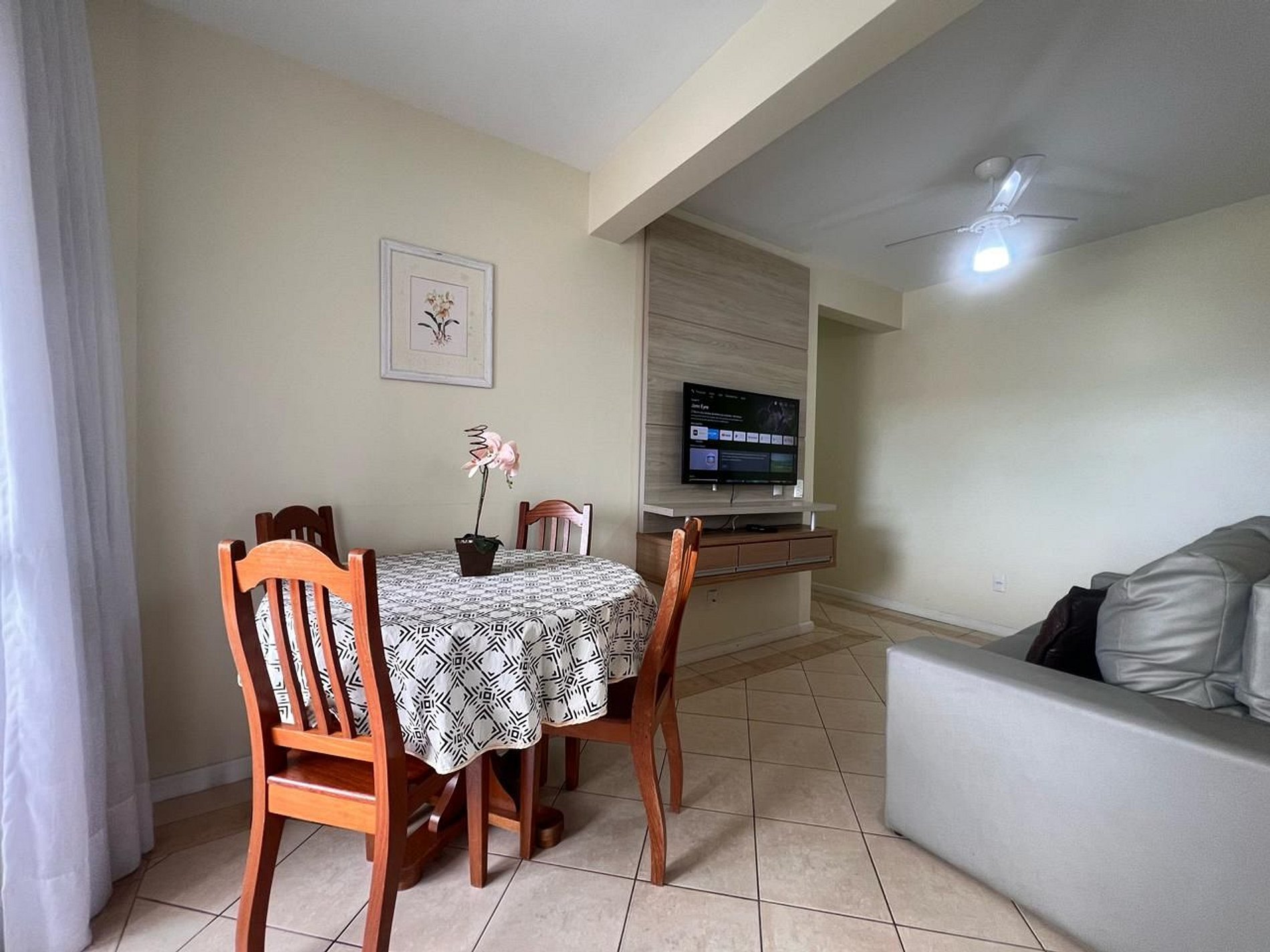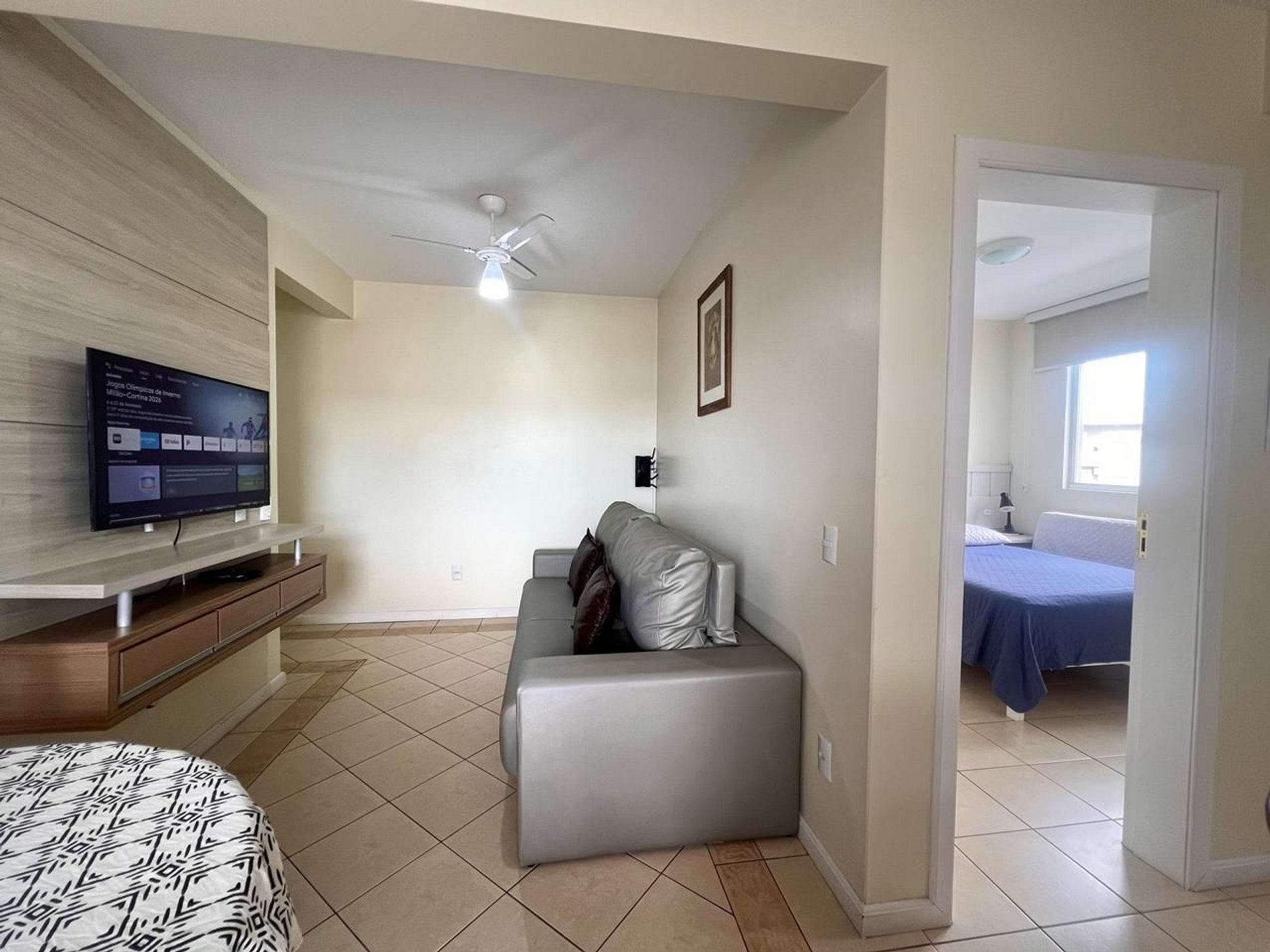 Sala de estar com sofá-cama, TV e ventilador de teto.