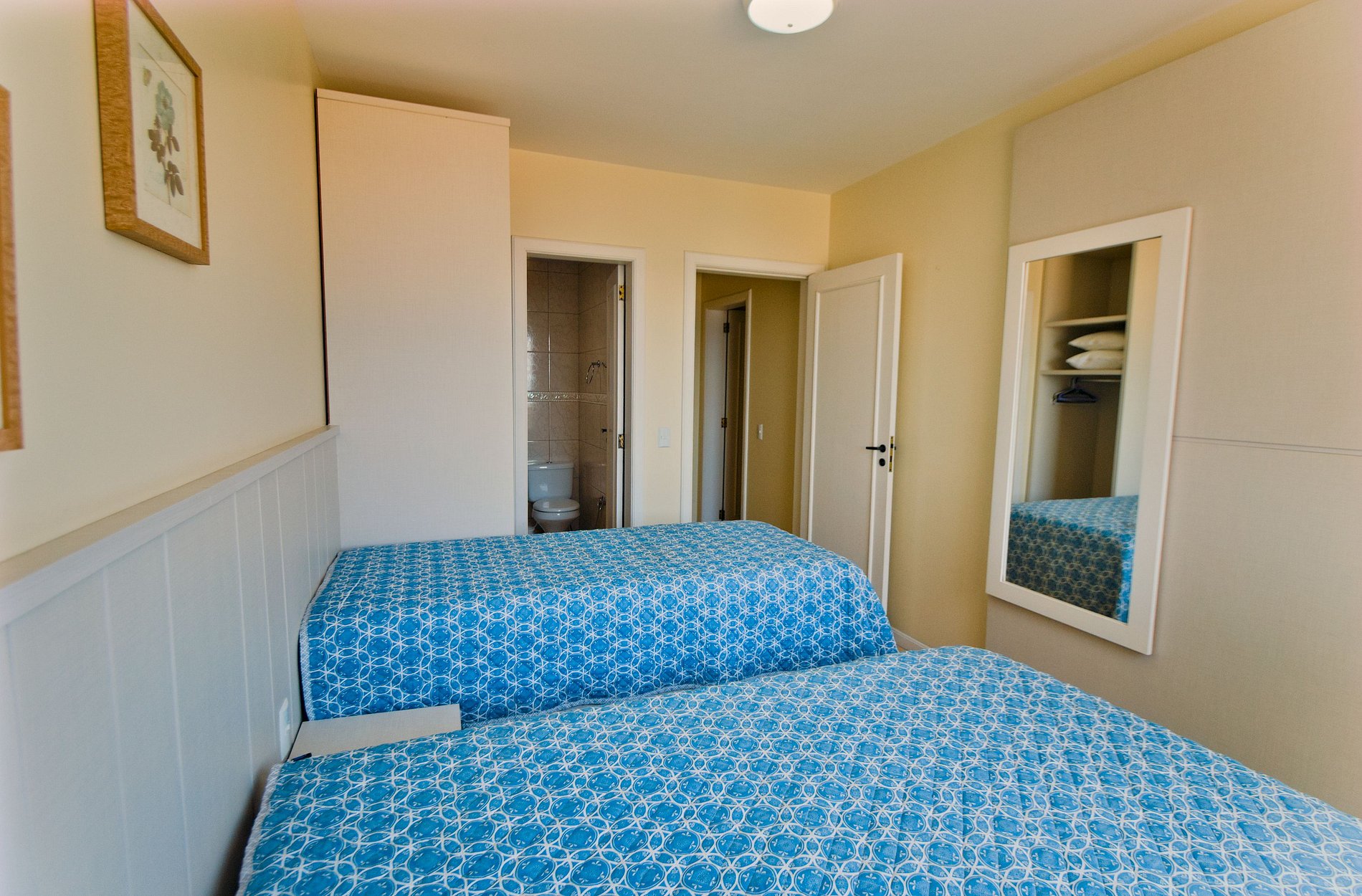 Suíte com 1 cama de casal, 1 cama de solteiro, ar-condicionado, roupeiro, cabides, travesseiros.